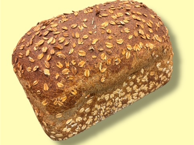 Een volkorenbrood met 90% volkorenmeel, 10% roggebloem en mout. Afgemaakt met geplette haver.