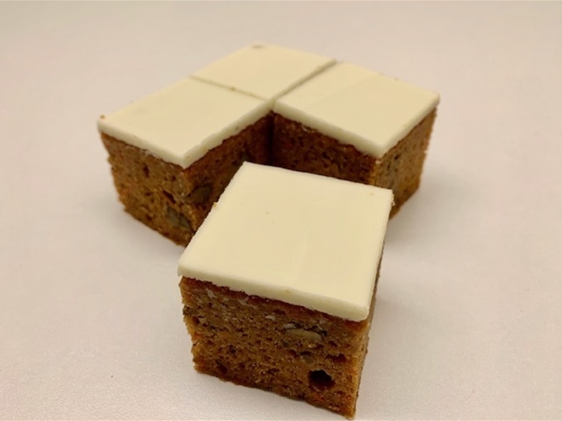 Cakestukje gevuld met worteltjes, walnoten, kaneel en afgemaakt met witte chocoladetruffel